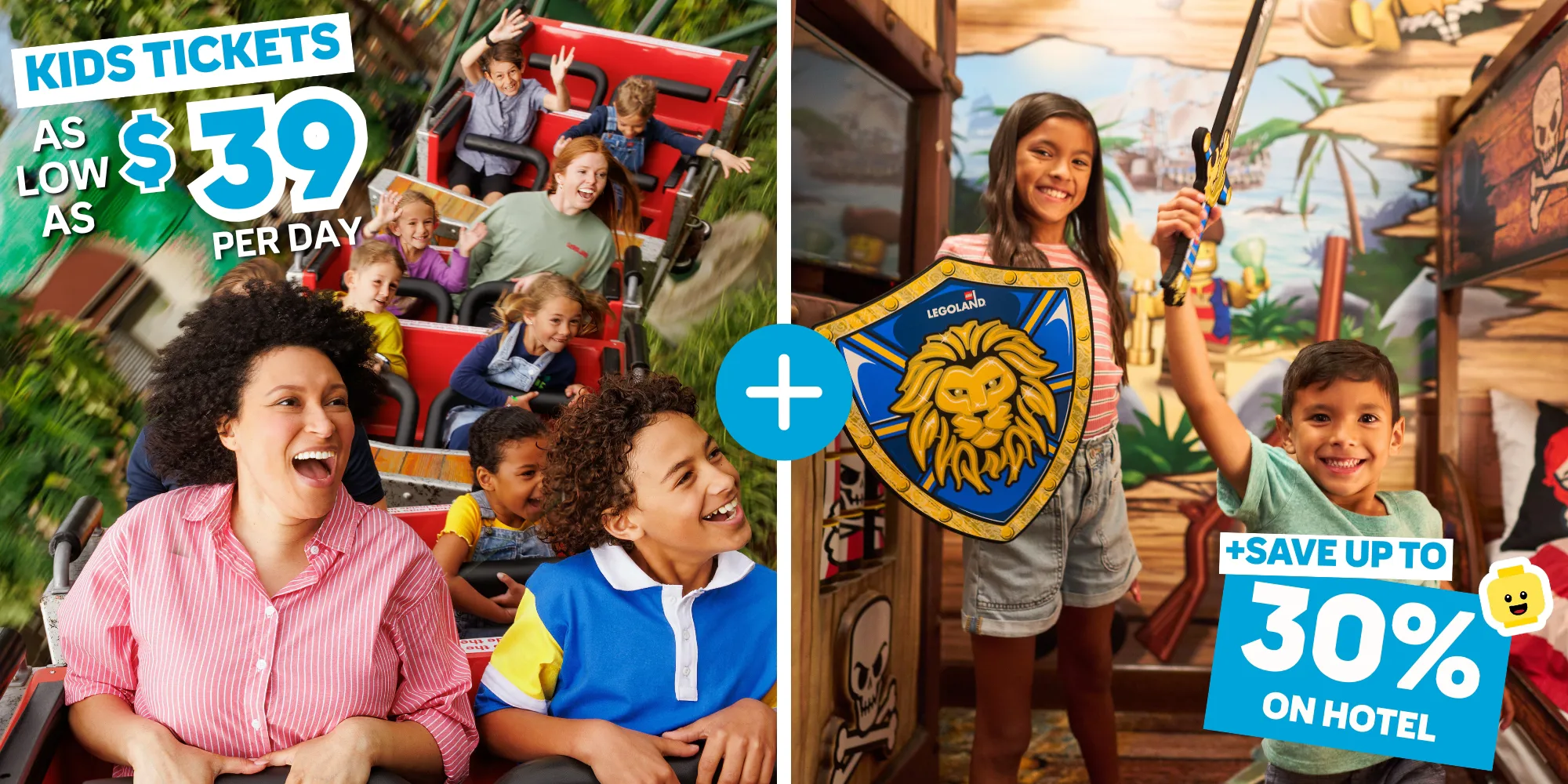 Offer valid for 1-Day Hopper admission for children ages 2-12 through September 13, 2024. Must be purchased online in advance and requires purchase of at least one (1) full-priced adult LEGOLAND Hopper ticket in the same transaction, with a limit of four (4) discounted child tickets per transaction. On dates the Water Park is open, offer valid on Resort Hopper Tickets. On dates the Water Park is closed, offer valid on SEA LIFE Hopper Tickets. Child ticket type will match adult ticket type purchased within the same transaction. Maximum of four transactions per customer during promotional window. Blockout dates and capacity restrictions may apply to this promotional offer, and additional blockout dates may be added at any time. Limited quantities are available. On any given operating day within the promotional window, a limited number of tickets will be available within the $39 Kids Ticket package, after which a limited number of tickets will be available within a $49 Kids Ticket package, after which all remaining Kids Tickets will be available for $59. When available Kids Ticket tiers sell out for any operating day within the promotional window, no further Kids Tickets will be available at that price for that operating day. Standard ticketing terms and conditions also apply. See LEGOLAND.com for days and hours of operation.