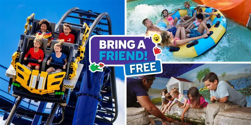 Bring a Friend tickets allow eligible Platinum and Elite Annual Passholders to invite a friend to join them at LEGOLAND® Theme Park with a complimentary dated Park Hopper ticket, valid during specific booking and travel windows for all parks that are open. Water Park is included if open for the season.